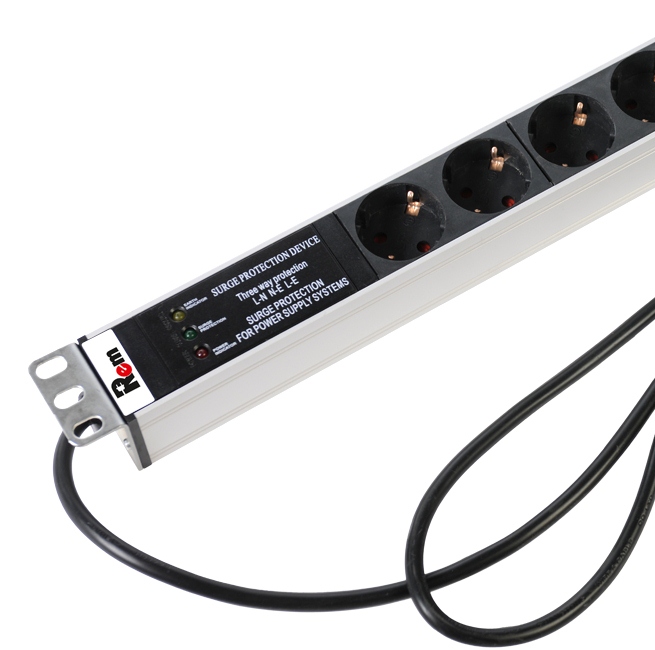Блок силовых розеток имеет десять портов стандарта Schuko и десять портов стандарта IEC 60320 C13, выполнен в анодированном алюминиевом корпусе. Розетки расположены под углом 45%, для удобного подсоединения коленчатых штекеров. Блок имеет фильтр защиты с индикатором питания. Кабель питания 3 метра. Блок предназначен для установки в шкафы 33-48U. Поставляется в индивидуальной упаковке с комплектом крепежа.