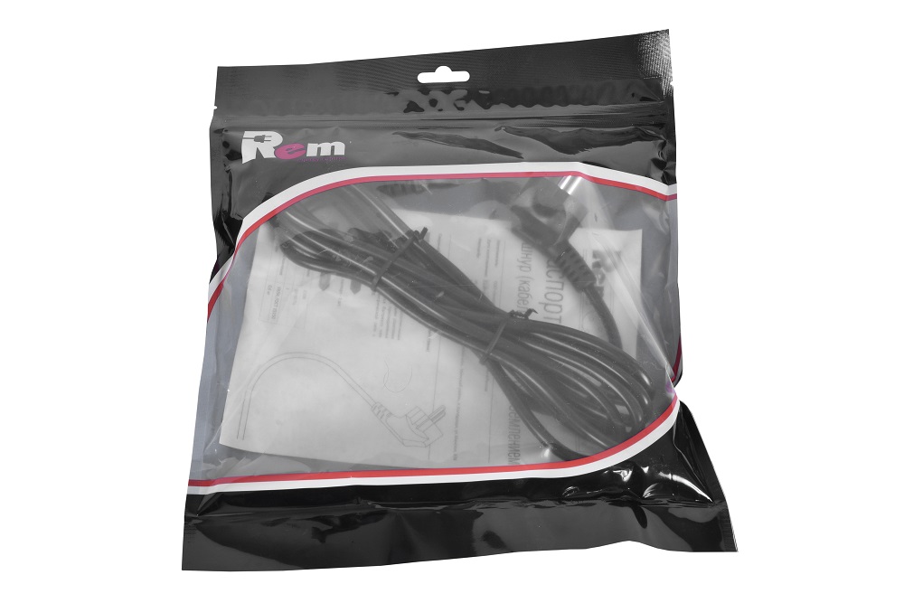 Шнур (кабель) выполнен из ПВХ черного цвета, имеет опрессованную розетку IEC 60320 C13 и вилку EU-Schuko. Кабель состоит из трех многожильных проводов сечением 1 мм, имеет заземление. Номинальный ток нагрузки: 10А. Номинально напряжение: 220-250 В. Длина кабеля 5 метров.