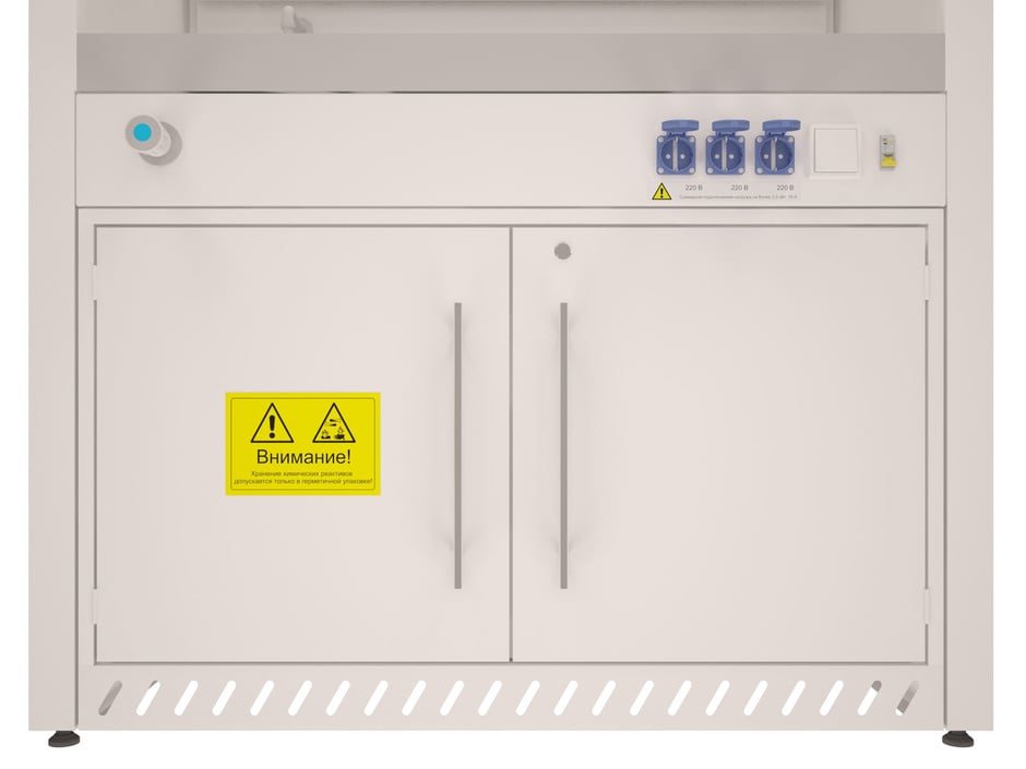 На сервисной панели установлены: автомат аварийного отключения питания 16 А, три брызгозащищенные розетки, выключатель освещения, электромонтажная распределительная коробка с обратной стороны основания. Для подключения к системе вытяжной вентиляции тумба оснащена фланцем диаметром 100 мм.