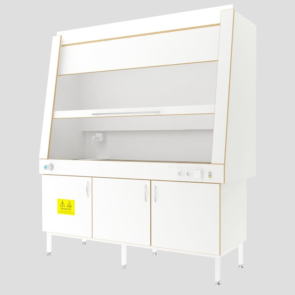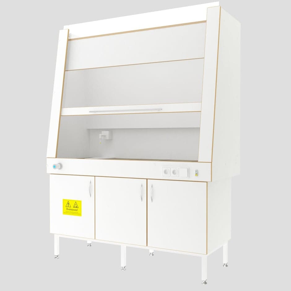 Шкаф вытяжной предназначен для работы с летучими и агрессивными химическими реактивами. Конструктивно состоит из верхнего вытяжного купола и нижней опорной тумбы для хранения реактивов, оборудования, расходных материалов, инструментов. Верхняя часть оснащена подъемным ударопрочным стеклом «Триплекс». Стекло с противовесами фиксируется на любой высоте. По переднему краю рабочей поверхности установлен противопроливочный бортик, исключающий попадание случайно разлитых агрессивных жидкостей на оператора.