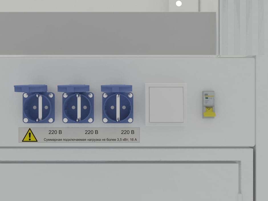 На сервисной панели установлены: автомат аварийного отключения питания 16 А, три брызгозащищенные розетки IP 54, выключатель освещения, электромонтажная распределительная коробка с обратной стороны основания.