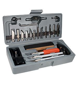 8894 набор ножей: • 3 ножа различных диаметров • шлифовальный брус • 2 скребка с разной шириной рабочей поверхности • рубанок • сменные лезвия: 8 лезвий для резьбы, плоская стамеска, 4 полукруглых стамески, 2 фигурных лезвия • пинцет