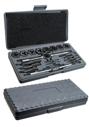 • Набор метчиков и плашек является универсальным и используется для нарезания как внешней, так и внутренней резьбы (от М3 до М12). Кроме метчиков и плашек в набор также входят воротки для метчиков и плашкодержатели.
