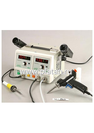 Паяльная станция имеетц ифровую регулировку температуры пайки, которая отображается на двух цифровых индикаторных дисплеях станции. Внутри основного блока находится также компрессор для создания вакуумного разряжения до 500 мм. рт. ст., подсоединяемый через специальный штуцер передней панели к отсасывающему устройству. Для удобства в эксплуатации фильтр отсасывающего устройства выполнен из термостойкого стекла.