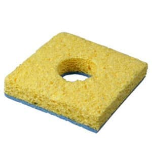 Вискозная губка размером 55x55 мм с центральным отверстием и прорезью для быстрой, аккуратной и безопасной очистки паяльных жал и насадок.